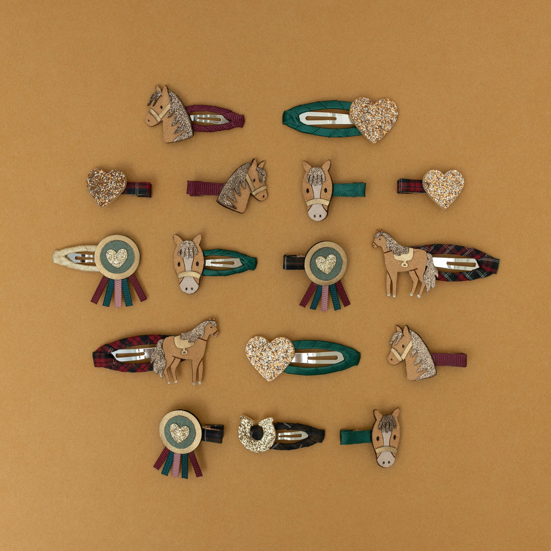Diese entzückenden Pony Pals Mini-Clips sind das perfekte Accessoire für kleine Pferdefans. Mit detailreichen Motiven wie Pony, Rosette, Herz und Hufeisen verleihen sie jeder Frisur einen verspielten Charme und bringen ein Stück Reitplatz ins Haar.