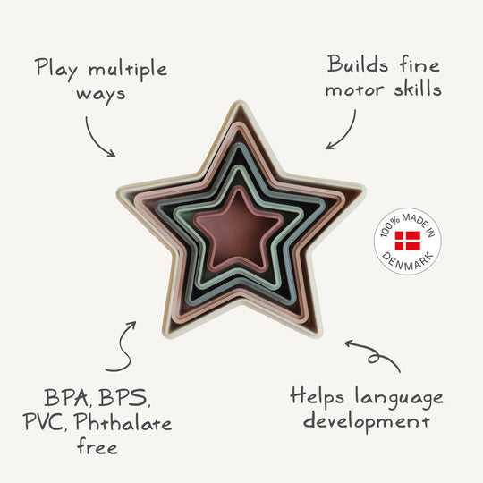 Entdecken Sie die zauberhaften Mushie Nesting Stars – fünf ineinander stapelbare Sterne in sanften Farben, ideal zur Förderung der Feinmotorik und Kreativität Ihres Kindes. Hergestellt aus sicherem, BPA-freiem Kunststoff und inspiriert vom skandinavischen Design – perfekt für Babys ab 0 Jahren. Made in Denmark.